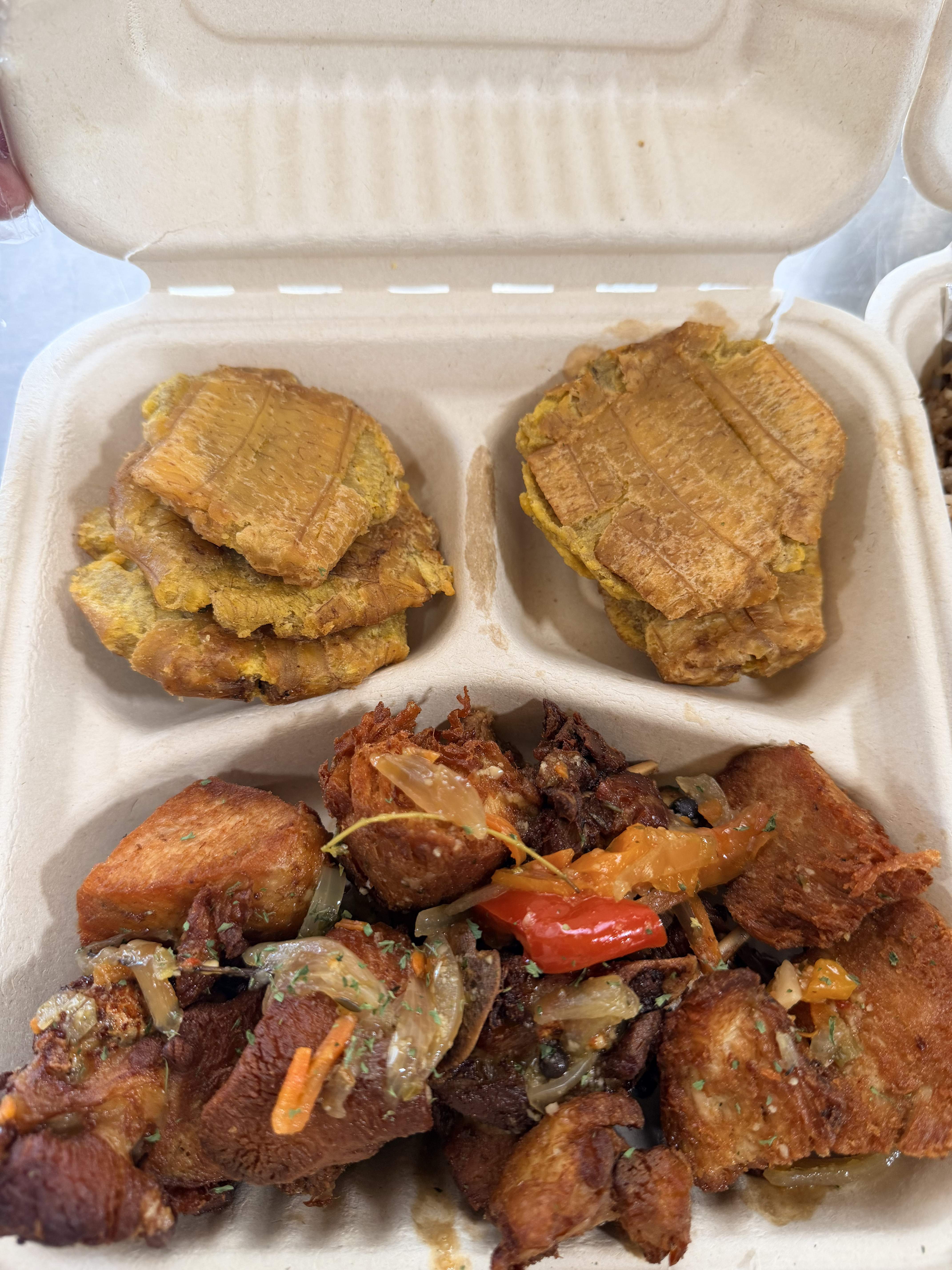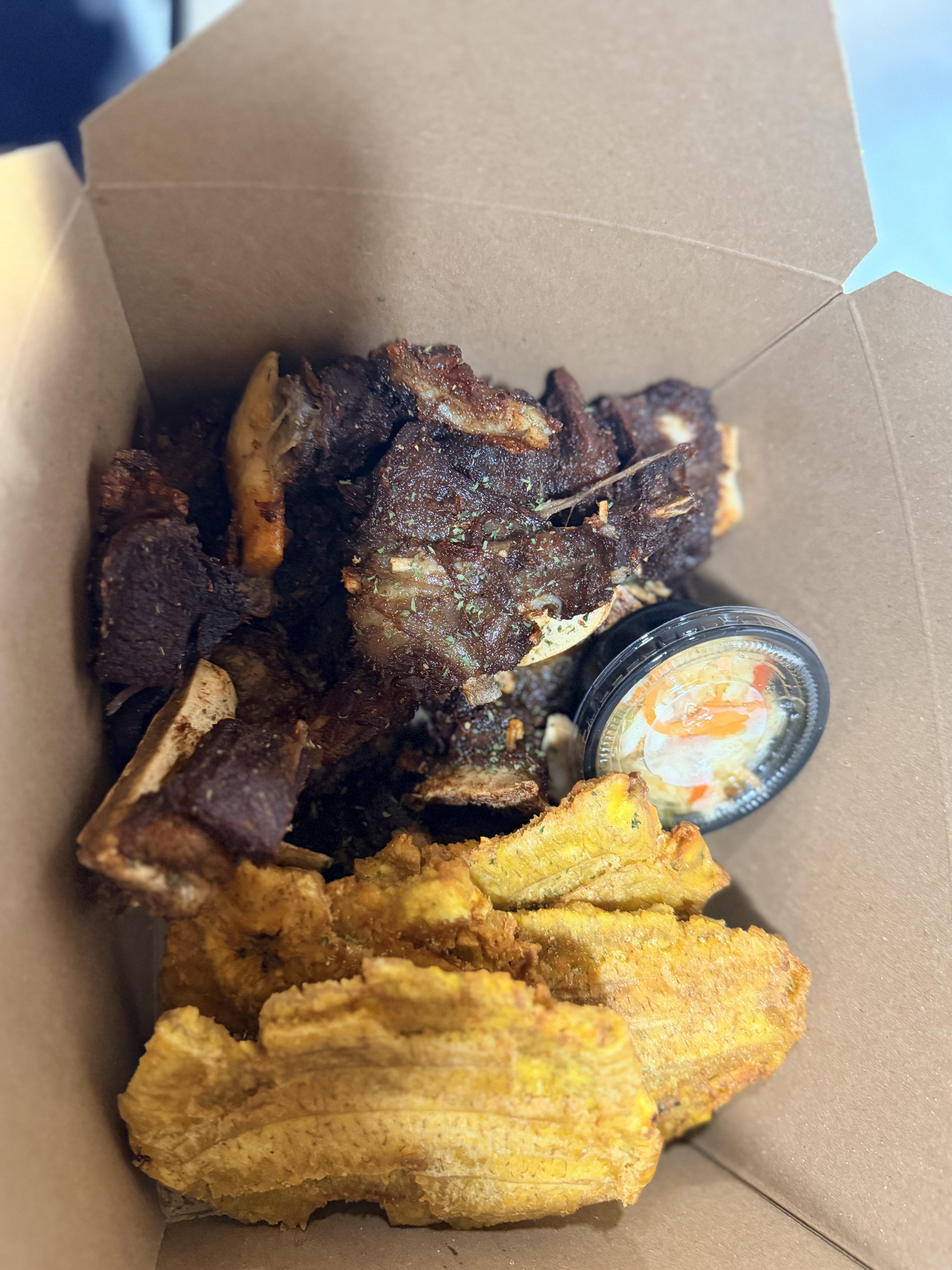 Crispy fried goat with rice, plantains, salad, pikliz & Creole sauce