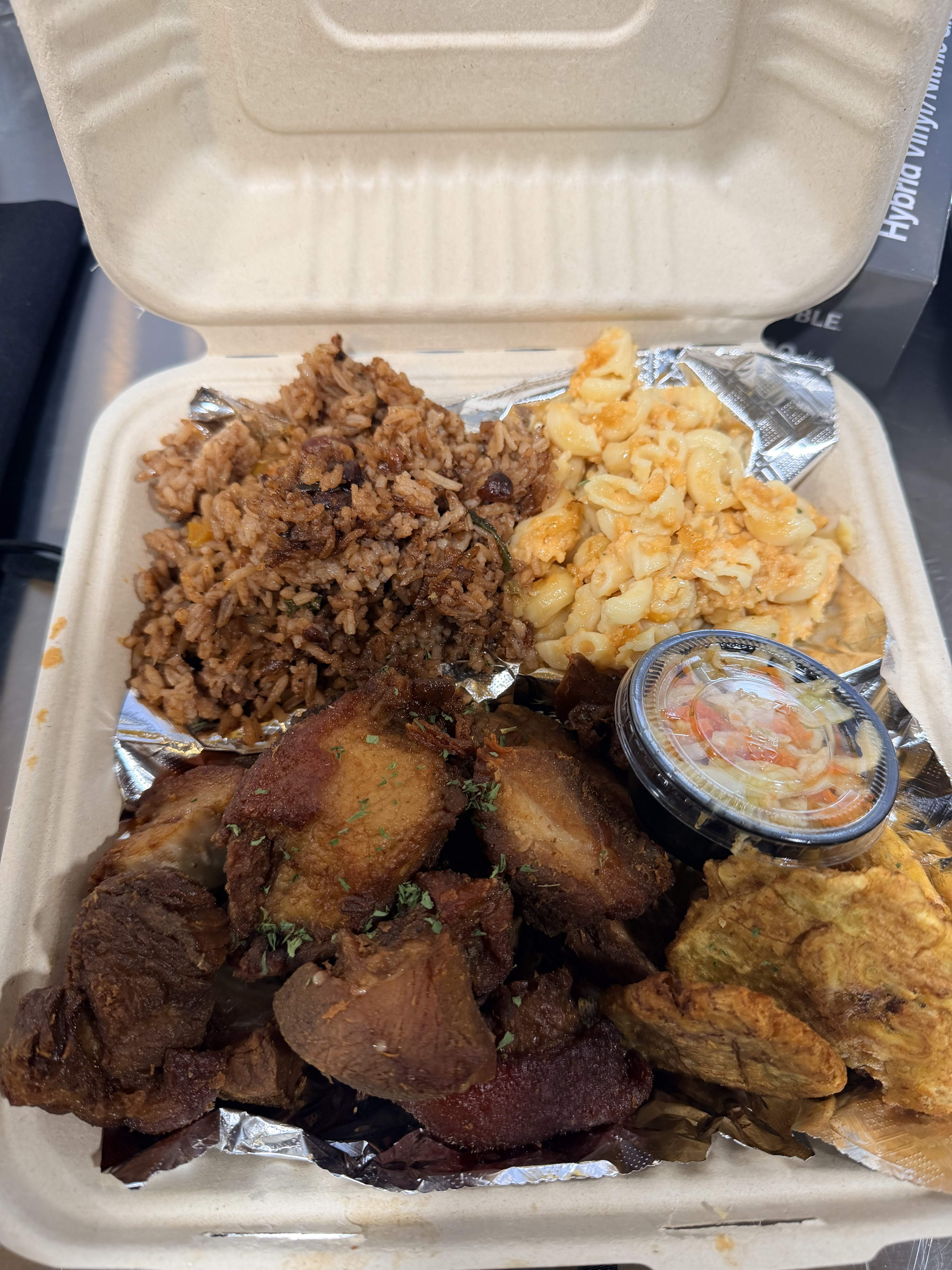 Crispy marinated pork with rice, plantains, salad, pikliz & Creole sauce