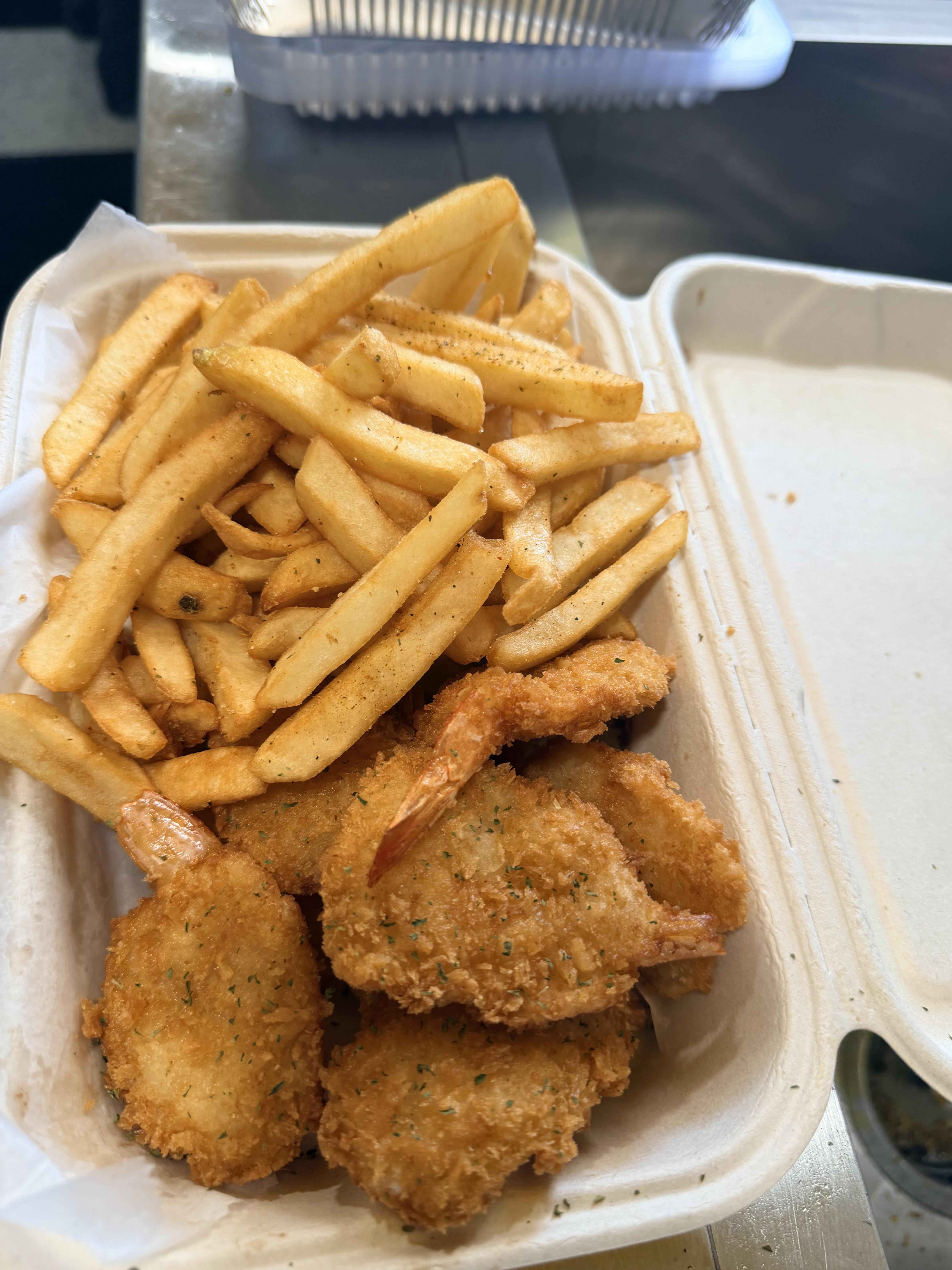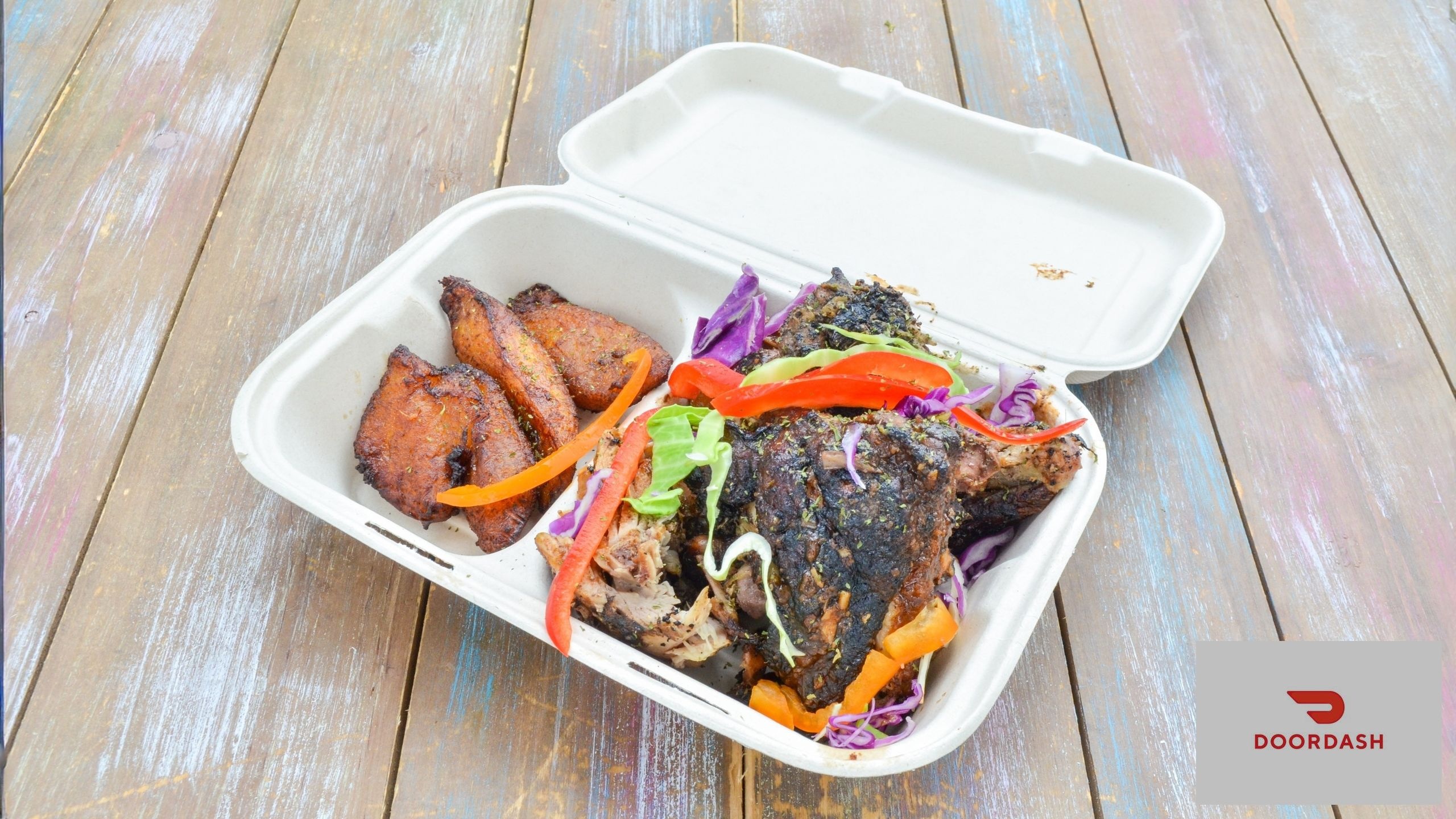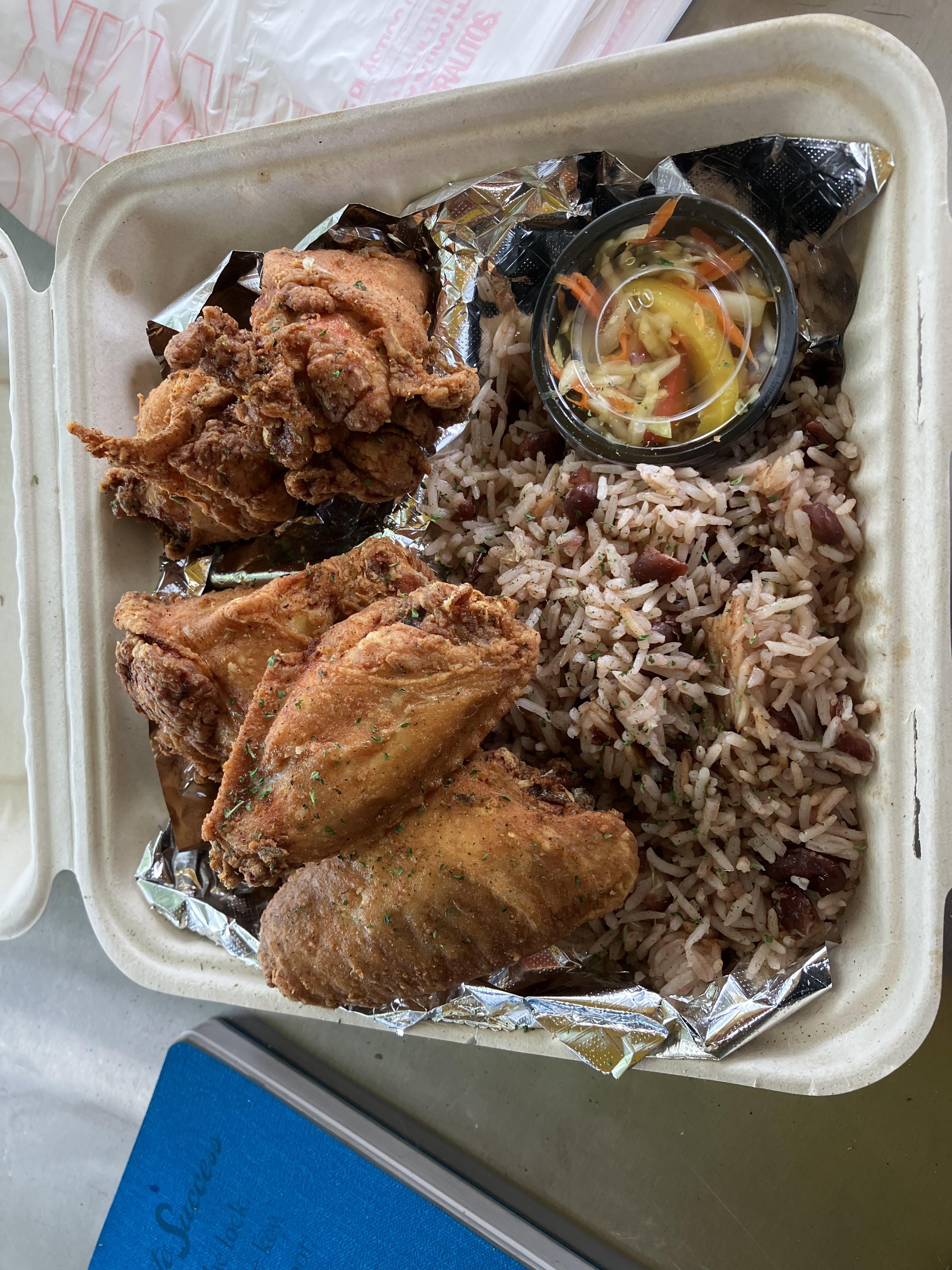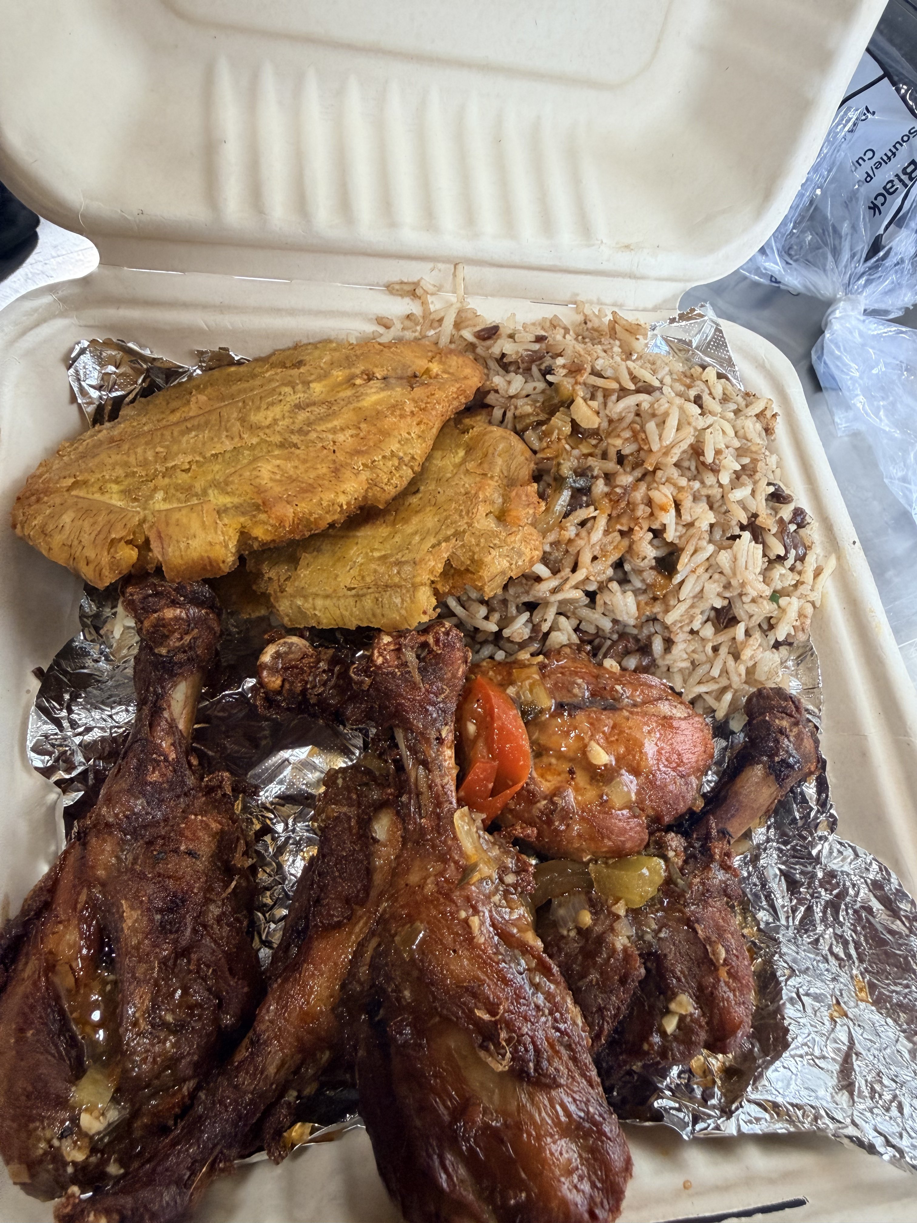 Crispy fried chicken with Rice & Peas or Black Mushroom Rice, fried plantains, salad, pikliz & signature Creole sauce