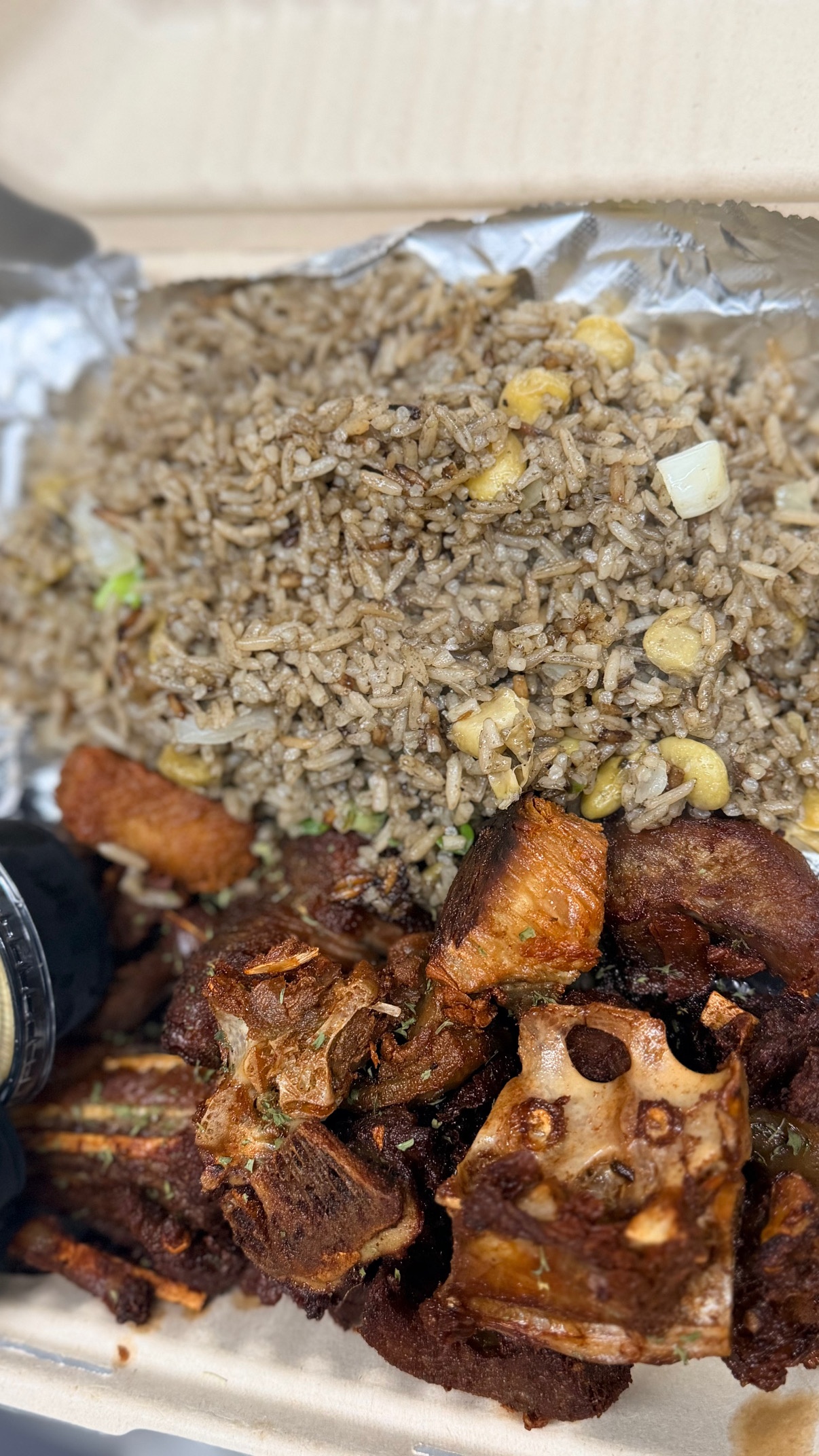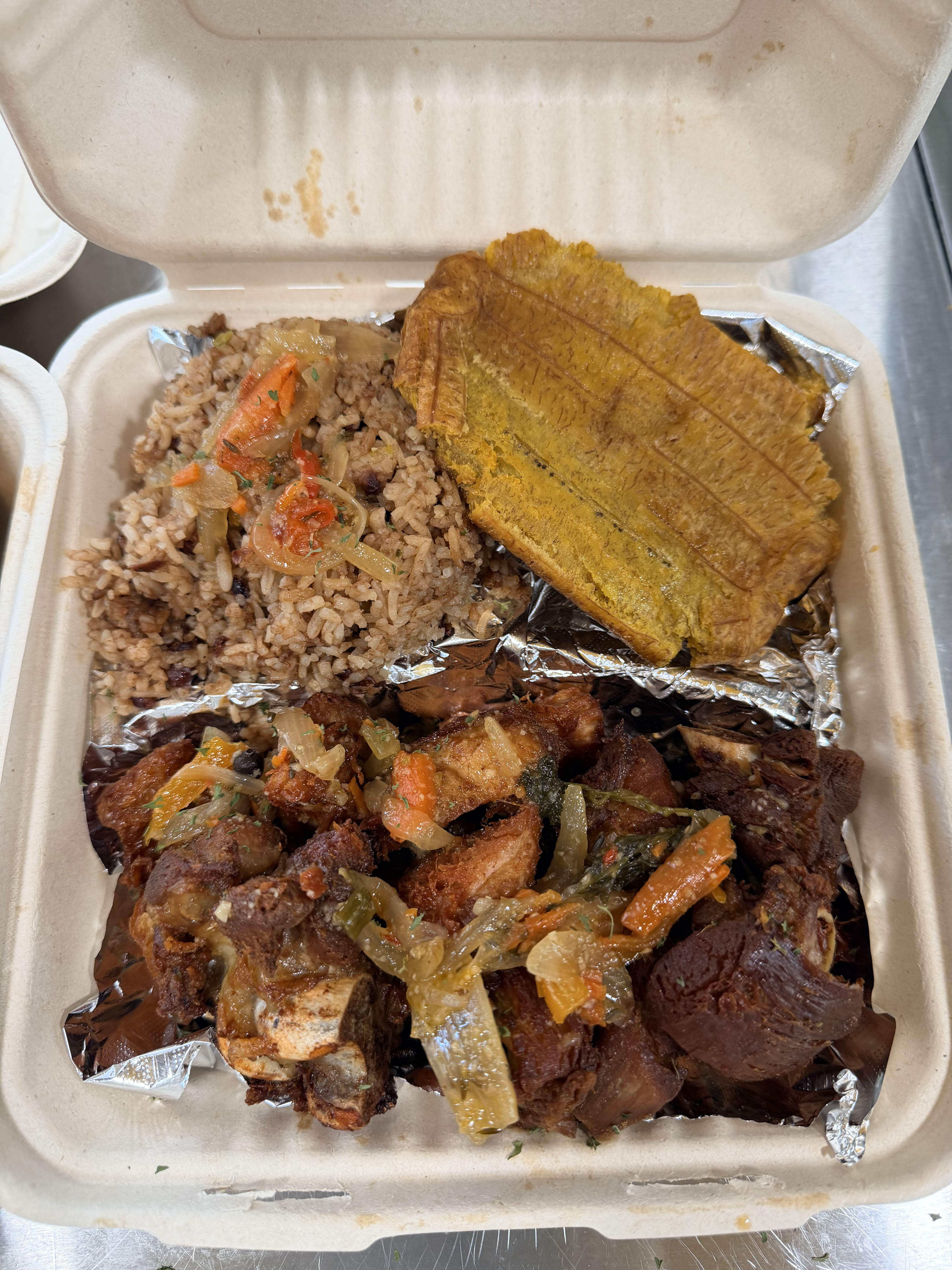 Fall-apart tender oxtail in rich Creole sauce with rice, plantains & sides