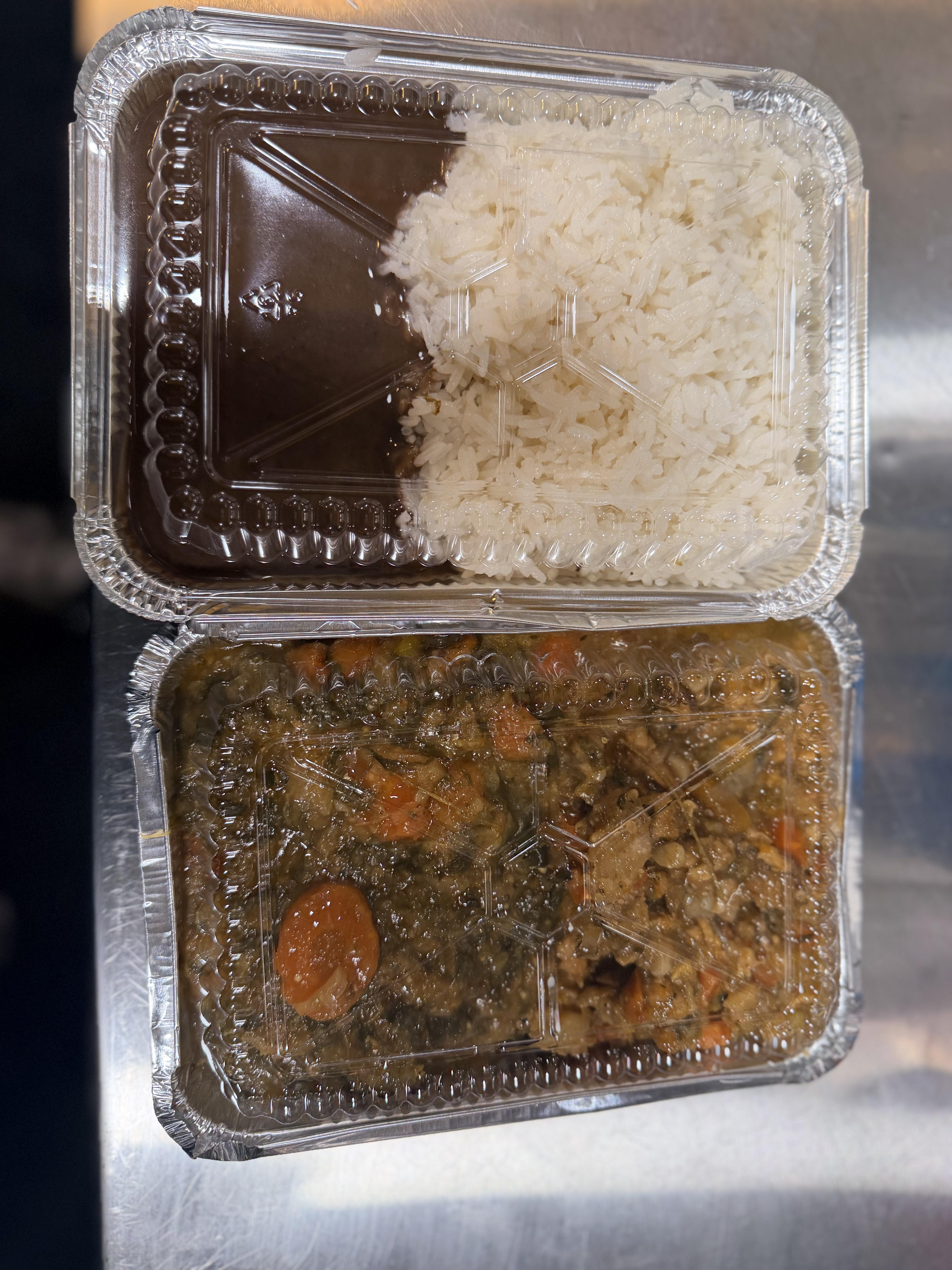 Tender stewed chicken in rich brown gravy with rice, plantains & sides